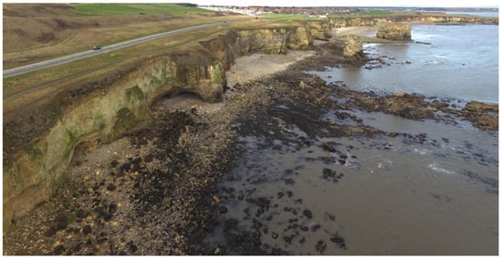 The third rockfall database has been derived from the coastal cliffs at Marsden Bay, located just south of the river Tyne in the northeast of England (Figure 6). The focus area is a 740-m coastal stretch comprised of three shallow bays where the close proximity of the eroding cliffs threatens a key road, the A183, that connects the coastal communities of South Shields and Whitburn [39]. The cliffs are approximately 27 m high and expose clear layers of dolomitic limestone, secondary limestone, and areas of breccia [40]. The cliffs are fronted by shore platforms, pocket beaches, and boulder fields in places that refract and dissipate nearshore wave energies. The rockfall database is described in detail in [40] but was generated from 24 terrestrial laser scanning surveys with a resolution of 10 cm captured approximately monthly between February 2015 and March 2017, producing more than 30,000 rockfalls.