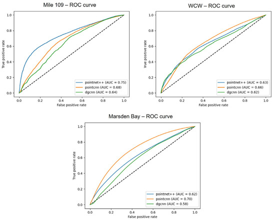 Further observation of the ROC curves of the trained models for each case’s test dataset in Figure 7, validates the superiority of PointNet++ compared to the two other DL methods at the Mile 109 site, especially in the lower FP and TP rates. The ROC graphs also reveal the relative stability of the PointCNN models, which consistently maintain an arch-like curve shape in contrast to the slight fluctuations of the PointCNN and DGCNN models. PointCNN also shows relatively good learning behavior, while DGCNN seems to be the least performing 3D DL architecture given the available data at the time. There is a general pattern of PointCNN learning more useful information to relate to rockfall activity and perform site-specific RSM at different settings, with prediction confidence ranging between 66% and 70%.