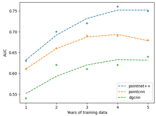 To further assess the learning process, its improvement, and the potential of this novel approach to RSM, the predictive capabilities are analyzed using different time frames in the database. The Mile 109 database is divided into 12-month intervals and assessed seasonally. As such, a year is defined as the period between the 1st of November and the 31st of October of the next calendar year, starting from 2013 to 2018. The Mile 109 site was selected due to the highest scores that are achieved for this site as well as the relatively even rockfall frequency between epochs. The five fractions are passed into the three models successively, and the predictions are evaluated based on the standard test dataset. By generating and using additional training examples from rockfall monitoring campaigns every year, the ability of the models to cope with RSM increases for all the models and particularly for PointNet++, which presents an almost 14% improvement throughout the first 4 years of training data (Figure 8).