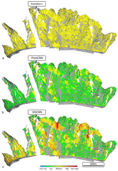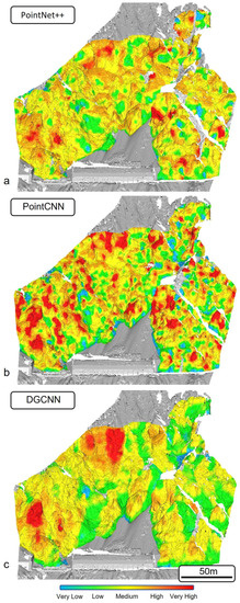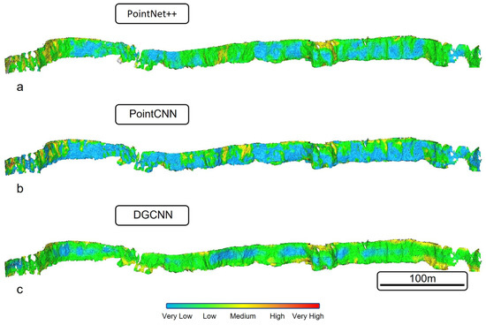 The Mile 109 site is a typical tectonized sedimentary environment with steep and sharp rock sections as well as benches and smoother areas formed by bedding and tectonic discontinuity planes. In this setting, the majority of the failures are sourced from the steeper sections, spires, and overhanging blocks. In general, all models tend to predict that most of the steep parts of the slope are more susceptible to rockfall (Figure 9). The rockfall susceptibility maps produced by PointNet++ and PointCNN are similar except that PointCNN evaluates the “high” susceptibility areas of PointNet++ as “very high”. Both architectures are able to clearly differentiate between steep and sharp regions across the whole slope, placing them within the “high” and “very high” classes. In contrast, DGCNN neglects large, “low”-class areas along the crown of the slope that are known to have generated intense rockfall activity in the past years [30,35].
