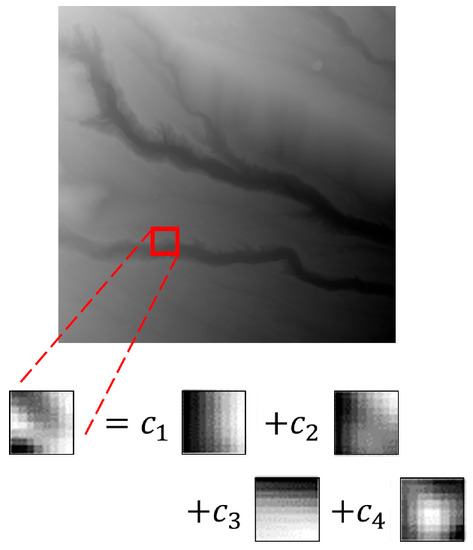 It is worthwhile to consider the characteristics of the physical shape of the topography. Topographic quantities such as slopes, curvatures, and ground clearances have been commonly used to describe topographic features. These topographic features have been used to analyze the geomorphology of a target area by introducing knowledge of topographic formation mechanisms. In addition, many topographic classifications and representations have been created based on topographic features [5]. These results indicate that even limited topographic features can effectively represent the topography. If the topographic features are used as a basis, a combination of such features should make it possible to reproduce the topography. However, in the context of topographic reconstruction based on limited features, it remains unclear which bases are generally effective. In addition, from the perspective of generalizability, it is desirable to use as few bases as possible. Sparse modeling is a method that satisfies these requirements. It can extract important bases by assuming sparsity even when the number of data is limited. Owing to these characteristics, significant results have been achieved in image restoration. For example, the K-singular value decomposition (K-SVD) method has attracted attention due to its assumption of sparsity in the image space [6]. K-SVD uses a set of many bases (referred to as a dictionary) to represent an image. It assumes that only a small number of bases from this dictionary can be used to represent the image. The details of K-SVD are described in Section 3.2.2. Lustig et al. used an interpolation method that assumes sparsity in the frequency space of the image [7]. Here, the assumption is that an image can be represented using a small number of various frequency patterns.