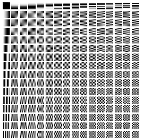 In the above, M is a mask matrix. The algorithm for solving the optimization problem uses OMP or elastic net regression, as described below. As there are deficiencies in , the computation process is performed only on the portion without deficiencies. Specifically, the mask matrix M is introduced to align the number of rows in each matrix. The dictionary is a redundant DCT dictionary, that is, a standard dictionary used in image compression such as JPEG (Figure 4). From the obtained sparse coefficients and dictionary A, the topography of the corresponding patch can be reproduced and interpolated as using Equation (2).