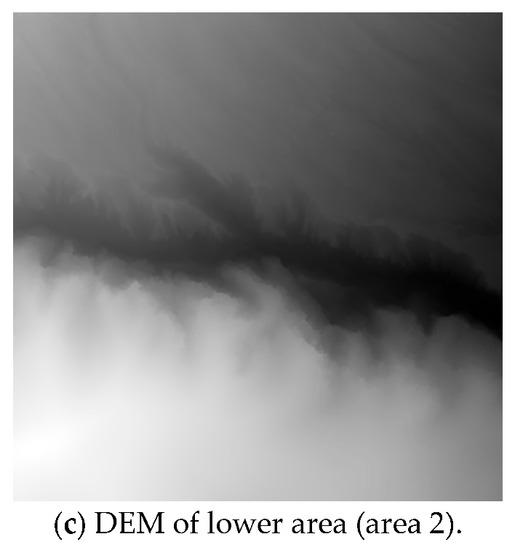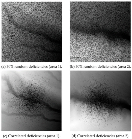 The methods were applied to DEM data with artificial deficiencies. The original DEM (Mt. Unzen, Nagasaki, Japan) comprised 1 m mesh data (512 × 512 m) obtained from an aerial laser survey (Figure 6). Two areas with different topographic shapes were selected. Area 1 (upper area) has a constant slope throughout (elevation 560 to 470 m) and several valley lines. The elevation of the valley floor is approximately 450 m. Area 2 (lower area) is a cliff section, with elevations above and below the cliff of 660 and 510 m, respectively. We prepared two methods for selecting deficient meshes: one randomly selected a mesh, and the other selected a mesh by considering spatial correlations. The deficiencies were set as 5%, 10%, 20%, 25%, 30%, 40%, 50%, 60%, 70%, 75%, 80%, and 90% in the cases of random deficiencies. Figure 7 shows an example of the DEM data with deficiencies. The black areas in the figures indicate the deficiencies. The root mean square error (RMSE) was used to evaluate the accuracy of the DEM generation.