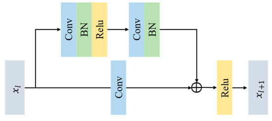 The ResNet is constructed by concatenating a set of residual blocks, and the detailed structure is shown in Figure 2. A residual block consists of a direct mapping and a residual component . The residual block can be defined by the following Equation (2), where , represent the input and output of layer , respectively. By using 1 × 1 convolution to resolve the different dimensionality of the feature maps of and , the residual block can be expressed by Equation (3), where , and 1 × 1 convolution is represented by .