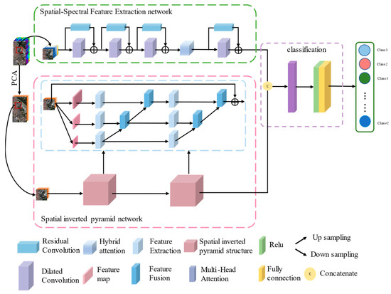 The structure of the MHNA mechanism is displayed in Figure 3, which is a parallel dual-branch architecture. The proposed approach has three components: a spectral-spatial feature extraction network, a spatial inverted pyramid network, and a classification network. The spectral-spatial feature extraction network contains three similar dilated convolution blocks combined with ResNet and a hybrid attention mechanism, which is applied to extract a substantial number of spectral signatures and a few spatial features. Additionally, the combination structure can effectively preserve and transmit the features obtained from the initial layers of the network. Next, the spatial inverted pyramid network is utilized to capture spatial features. The spatial inverted pyramid network includes two spatial inverted pyramid blocks. Each block consists of three down-sampling operations, four up-sampling operations, six feature extraction blocks, and four feature fusion blocks. Finally, the classification network includes a concatenate, a multi-head attention mechanism, a ReLu layer, and a fully connected layer, which are employed to obtain classification results. Among them, the concatenation operator is used to merge the features from different branches, and a multi-head attention mechanism can help the network pay attention to the information from different subspaces. The ReLu activation function introduces nonlinear properties into the model to improve network expressiveness. The fully connected layer is employed to generate the ultimate classification results.