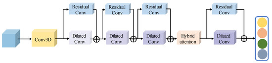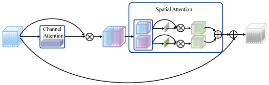 In the proposed network, a spectral-spatial feature extraction network is introduced to capture multiscale information from feature maps, as shown in Figure 4. It contains four similarly dilated convolutions combined with ResNet blocks (DR) and a hybrid attention mechanism. Additionally, the hybrid attention is located after the third DR block, which can greatly assist the fourth DR block to extract higher-level features of the network. The strategy can facilitate the network achieving a better performance in classification tasks. The architecture of the hybrid attention mechanism is depicted in Figure 5. Suppose is the input of attention, and multiplies it to a 1D channel attention tensor to obtain the channel-refined feature . is then divided into two groups, by the spatial attention submodule, which are called , . The two groups of features are produced their own 2D spatial attention tensors: , . By multiplying , with , , respectively, a pair of spatial refined features are named and , are generated. The process of a hybrid attention mechanism can be summarized by the following equations: