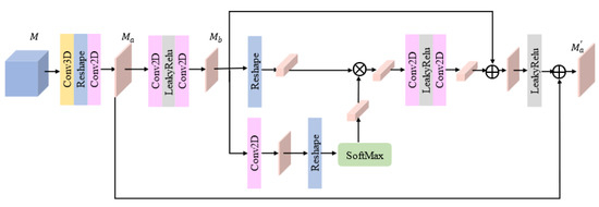 where denotes a set of operations, including 3-D and 2-D convolutions with kernel sizes (1 × 1 × 1), (2 × 2), and a reshape operator. represents 2-D convolutions with kernel size (3 × 3) and LeakyRelu. and are individual reshape operators, and a SoftMax operator is denoted by (). means a group of operations containing 2-D convolutions with kernel size (1 × 1) and LeakyRelu, stands for independent LeakyRelu operator. Finally, the output of the block is denoted by .