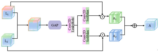 where GAP is the global average pooling. W_L represents a set of operations including a 2-D convolution using a kernel of size (1 × 1) and LeakyReLu operator. denotes a group operation containing a 2-D convolution applying a kernel of size (1 × 1) and SoftMax operators. and are element-wise products, obtaining and , respectively, as a result of the above operation. can be formulated as the ultimate output of the feature fusion block by Equation (14).