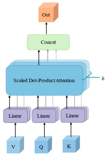 With , , and as input, the similarity of and is obtained by SoftMax after the inner product of and . In addition, is used as a scaling factor to prevent results from being too large, and the small gradient after SoftMax is not conducive to back propagation. The multi-head attention mechanism can be expressed by the following equations: