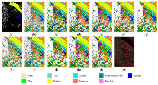 Three evaluation indicators are applied to evaluate the classification performance of the designed approach in the article, namely, overall accuracy (OA), average accuracy (AA), and Kappa coefficient (Kappa) [60]. The confusion matrix is introduced to provide a more intuitive display of the three evaluation indexes mentioned above. In general, it is expressed in the matrix form of . In the confusion matrix, the prediction labels are represented by each column, and the actual labels are represented by each row. The matrix can be defined as follows: