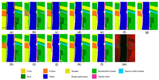 WHU-Hi-HongHu (HH): The HH dataset was captured by the RSIDEA research group of Wuhan University on 20 November 2017. The imagery size is 940 × 475 pixels, with 270 bands from 0.4 to 1.0 μm, and a spatial resolution of about 0.043 m. The dataset includes 22 classes, but 18 categories were selected from the original dataset in our experiment, and the processed image size is 331 × 330.