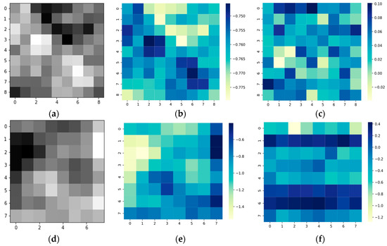The visualization heatmaps of attention mechanisms on PC dataset: (a) grayscale image before hybrid attention; (b) without hybrid attention; (c) processed by hybrid attention; (d) grayscale image before multi-head attention; (e) without multi-head attention; (f) processed by multi-head attention.