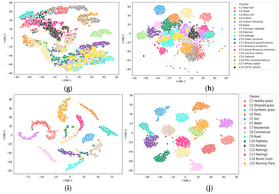 The visualization results on five HSI datasets are displayed in Figure 19. The results of the sample distribution of the PC dataset are illustrated in Figure 17. From Figure 19a, it is evident that C2 (Trees) overlaps with C3 (Asphalt) and C1 (Water) overlaps with C5 (Bitumen). It indicates that there is a high degree of similarity between overlapping different categories and it is difficult to distinguish them. The above problem is alleviated by the proposed MHNA, as shown in Figure 19b. It suggests that the proposed method has the ability to extract discriminative features for distinguishing similar classes. The visualization results from the SA dataset, the LK dataset and the HO dataset are shown in Figure 19c,e,i. As we can see, there are some samples of the same category with scattered distribution, such as C10 (Corn) on the SA dataset; C1 (Corn), C2 (Cotton), and C8 (Roads and houses) on the LK dataset; and C10 (Highway) and C15 (Running Track) on HO dataset. Figure 19d,f,j are visualization results processed by MHNA; the distance between samples of the same category is significantly reduced. This demonstrates that the proposed MHNA can effectively reduce intra-class intervals to aggregate the samples in the same category. Finally, the HH dataset contains a substantial number of samples of various categories, as shown in Figure 19g. All kinds of samples are mixed together except C8 (Pak choi), which has no obvious boundaries. The results, after being processed by the network, are exhibited in Figure 19h, and it can be seen that the samples in the same category are grouped together and clear boundaries appear between the different classes. This demonstrates that the MHNA can effectively increase the inter-class distance, which can contribute to the enhancement the classification accuracy. In summary, the MHNA contains a spectral-spatial feature extraction network, a spatial inverted pyramid network, and attention mechanisms, which can help the network to capture extensive spectral and spatial features.