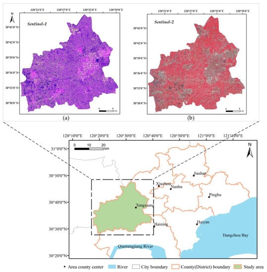 Location map and RS images of Tongxiang. (a) pseudo-color image of S-1 (pseudo-color image defined by combination of , and .); (b) pseudo-color image of S-2 (pseudo-color image defined by combination of bands B8 (near infrared), B4 (red), and B3 (green)).
