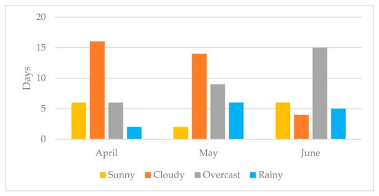 The study area is located in the south of China, which has a subtropical monsoon climate. Due to the influence of weather, the quality of optical data is seriously affected during the critical period of crop growth (April 2021 to June 2021). The weather conditions counted are shown in Figure 2, and the statistical data was obtained from http://www.weather.com.cn/ and https://weather.cma.cn (accessed on 11 April 2022). It can be shown that there were just 14 days from April to June that were sunny, while other days were cloudy, overcast, or rainy.