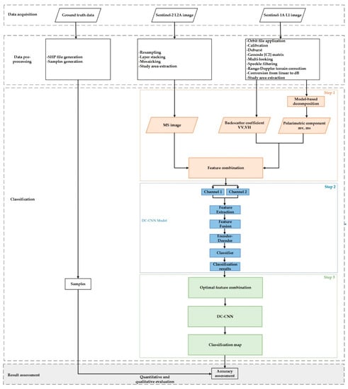The flow chart of the proposed method is shown in Figure 4. There were three steps in this crop classification method. Data acquisition and preprocessing should be completed beforehand. In step 1, on the one hand, the MS image was obtained from S-2 data. On the other hand, the VH and VV backscattering components and the polarimetric components from the model-based decomposition in [] were obtained from S-1 data. The above features were grouped into different combinations. In step 2, the DC-CNN model was constructed, which included three modules: a feature extraction module, a feature fusion module, and an encoder-decoder module. In step 3, the optimal feature combination was obtained by analyzing and evaluating the classification results of different feature combinations, and the final crop distribution map was acquired based on the trained DC-CNN model. In order to measure the accuracy of the classification results, qualitative and quantitative evaluations were made. Qualitative evaluation was applied to evaluate the classification results intuitively []. Compared with the samples obtained from ground-truth data, the classification results were interpreted and verified intuitively. To evaluate quantitatively the accuracy of each combination, various parameters (i.e., Macro-F1, Overall Accuracy (OA), and Kappa) were considered [,].