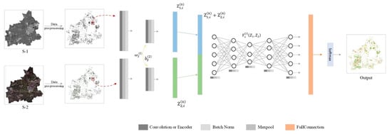 Because the characteristics of crops in S-1A and S-2B are different, two convolution kernels were set in the feature extraction module. The feature extraction process was shown in Equation (6):
