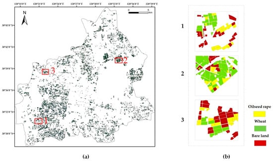 For the qualitative evaluation, three regions were selected and compared with the visual interpretation map; each region contained three types of farmland to be classified. Examples of these regions are shown in Figure 6.