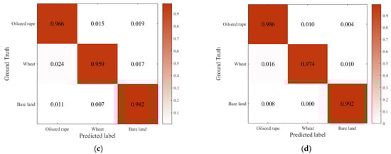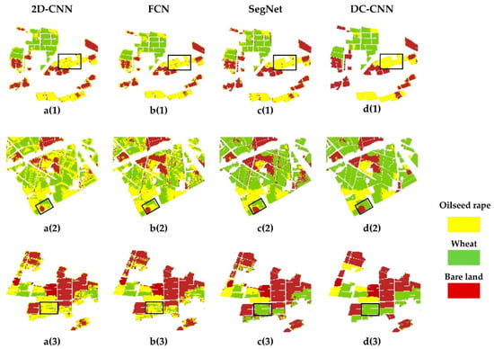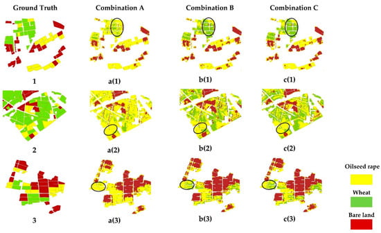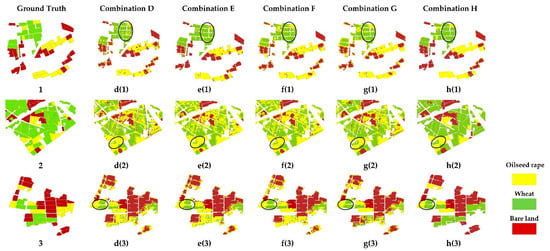 Figure 7 shows the local comparison of the classification results of three different feature combinations based on DC-CNN, among which the features were extracted from S-1. Obviously, when Combination A was used as input data, the classification result was not ideal. An OA of 76% with a Kappa of 0.462 was achieved. In the three types, the result of bare land classification was better than the other two types, and there was a serious confusion phenomenon between wheat and oilseed rape, as shown in the oval area in Figure 7a(1)–a(3), where a large amount of wheat was mistaken for oilseed rape. After the polarimetric components were introduced into the classification task (Combination B and Combination C), the confusion phenomenon was obviously reduced.