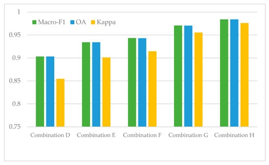 Combinations A to C were represented using only the different components extracted from the S-1, which made it convenient to analyze the performance of polarimetric components and in crop classification using only S-1 data. Combinations D to H were different combinations of multi-source features. Combinations F and G were set to evaluate the contribution of polarization features and to the classification of multi-source crops, respectively.
