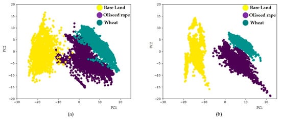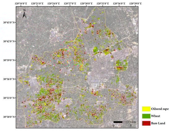 The vector data for farmland were obtained by manual measurement and the statistics of the local government. A reliable farmland boundary is beneficial to the final mapping of crop distribution. A field investigation was conducted from 10 May to 12 May 2021, to collect samples of crops in the study area. The farmland we studied was a government-planned field provided by the local government. During the study period, the planting status of farmland can be completely divided into three categories: oilseed rape, wheat, and bare land. There were also economic crops such as mulberry in Tongxiang city, but they were not involved in our experiment. In order to ensure the uniform distribution and quantity of samples, three experts interpreted and supplemented the samples according to a 3.8-m high-resolution remote sensing image (GF-1 optical image on 1 May 2021) and Google images (Landsat-8 optical image on 29 April 2021). The number of expert interpretation samples accounted for about 10% of the total sample. Finally, 305 plots were obtained as samples (19,540 pixels), including 101 oilseed rape (6038 pixels), 103 wheat (7418 pixels), and 101 bare lands (6084 pixels). The sample distribution is shown in Figure 3.