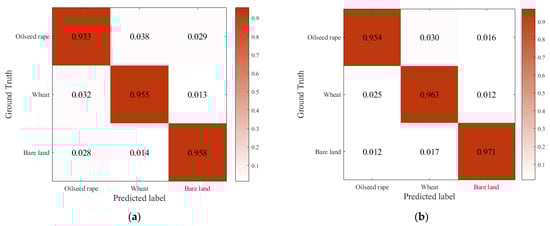 The classification accuracy obtained by only optical was about 5% higher than that obtained by only SAR, and the target type can be better reflected in optical data, which is the same conclusion as [,,,,]. The cooperative use of SAR-optical provided multi-dimensional information, including the physical scattering mechanism of SAR and the MS of optical data, and the classification result was better than that of a single sensor. As shown in Table 11, compared with S-1 and S-2 alone, the OA of synergy between S-1 and S-2 is improved by 15% and 10%, respectively. [] also showed that compared to the sole use of S-1 and S-2 data, combining S1 and S2 can improve OA by 3% and 10%, respectively. The classification result in this paper was more accurate (OA improved by almost 5%) than that in the literature []. On the one hand, there may be relatively few crop species in the study area; on the other hand, the importance of SAR polarization information has been frequently discussed in many crop classification studies, such as wheat and oilseed rape [,,]. The experiment in this paper showed that the polarimetric components obtained by the new decomposition method [] had a more outstanding contribution to classification than VV/VH. Polarimetric components were highly sensitive to crop canopy structure. Since the vertical state of canopy structure in wheat maturity is obviously different from that in oilseed rape, components performed well in classification tasks. As can be seen from Table 9, the final classification results obtained by the proposed method were more accurate than those obtained by the other comparison methods. Compared with 2D-CNN, FCN, and SegNet, the Macro-F1, OA, and Kappa improved by 2–4%, 2–4%, and 2–5%, respectively. However, in the early growth stages of wheat and oilseed rape, due to their similar physical characteristics, the contribution of polarimetric components will be affected to some extent. In the future, other features that can effectively distinguish wheat from oilseed rape will be used for classification.