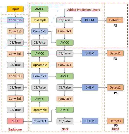 As seen in Figure 1, compared with the original three detection layers of YOLOv5s, detection layer P2 contains richer texture and more detailed information due to fewer down-sampling operations, which can help the model to detect small objects in remote sensing images more effectively, so we propose the addition of detection layer P2 to detect small objects on feature maps.