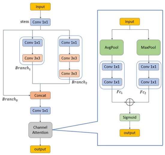 Specifically, firstly, 1 × 1 convolution is used to bring down the number of feature channels and thus reduce the computational effort; secondly, the information of different scales is extracted by three branches, respectively, and cascaded to obtain the feature map with multi-scale information, then 1 × 1 convolution is used to organize the information in the feature map and decrease the number of channels; and finally, the model will obtain accurate and non-redundant feature information for final object detection. The formulae are shown in (1) and (2).