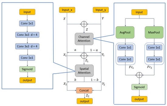 Specifically, given two feature maps , firstly, and are selected for initial feature fusion by element summation to obtain feature map . Secondly, feature map Z is input into the channel attention mechanism module to obtain weights that help the network to focus on small-object information through pooling and convolution operations, and then weights and weights are applied to feature maps and to get and , respectively. Then, and are summed by elements for the second time to acquire the feature map , and the feature map is input into the spatial attention mechanism module to obtain the spatial weights associated with the object task . The attention mechanism uses expanded convolution to expand the perceptual field and aggregate the contextual information. The weights and are then applied to the feature maps and to obtain and , respectively. finally, the channels of and are stitched to obtain effective feature information at different scales.
