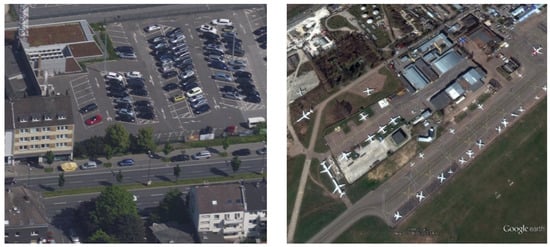 In the experimental work, we used two datasets. One was the open-source dataset VisDrone2021 [38], which contains 10 categories and is shown schematically in Figure 5. The number of each type of object in this dataset varied considerably, so we selected two of these categories, car and pedestrian, to train, validate, and test. A total of 8629 images were allocated according to the original proportion of the dataset, with 6471, 548, and 1610 images in the training, validation, and testing sets, respectively. One was a homemade dataset with 1156 images containing two categories: airplane and car, of which the training set, validation set, and test set had 739, 185, and 323 images, respectively, as shown in Figure 6. We counted the object sizes in both datasets according to the criteria of the MS COCO dataset [39]. Additionally, we also counted the number of tiny objects with less than 16 × 16 pixels, as shown in Table 1.