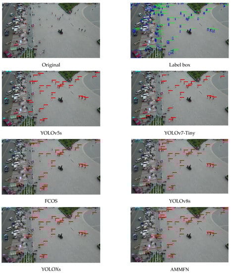 To validate the detection capability of AMMFN, we compared it with some benchmark networks. To ensure the fairness and reasonableness of the experiments, we retrained, validated, and tested all the comparison models. The results are seen in Table 5, and it can be seen that the overall evaluation index values of the AMMFN are higher than those of the YOLOv5s network. Compared with other networks, although AMMFN had slightly lower values and slightly lower values than the three models YOLOv8s, YOLOXs, and FOCS, the AMMFN had a smaller number of parameters and smaller GFLOPS than the three models YOLOv8s, YOLOXs, and FOCS. Additionally, the value, value, value, and values of the AMMFN were higher than those of other compared model networks. This shows that the AMMFN can obviously improve the detection performance of small objects with lower parameters and lower arithmetic power, and can detect more small objects while the prediction boxes are more accurate.