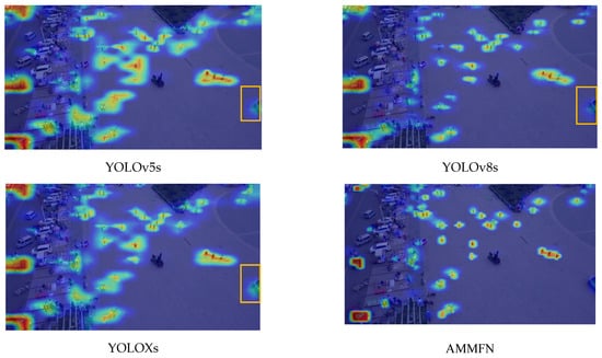 The modules proposed in this paper introduce attention mechanisms. To demonstrate whether the attention mechanism has a considerable impact on the models, we visualized the detection results of four models, YOLOv5s, YOLOv7-Tiny, YOLOv8s, and AMMFN, using a heat map. The results are shown in Figure 8. The darker the color, the more important the region is to the model. Compared to other models, it can be seen that AMMFN is able to focus precisely on task-relevant objects. Other models treat the railing as a car category and as important information; in contrast, AMMFN is able to competently mitigate the interference that this background information brings to the model, as shown in the yellow boxes in the figure. The reason for this is that the attention mechanism used in the AMMFN enhances the feature information of the objects and improves the ability of the model to perceive them.