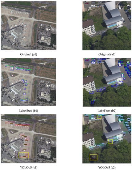Pictures of detection results of YOLOv5s and our model. The green and blue lines indicate the box and category of the label, respectively. The red and light blue boxes indicate the forecast boxes for the aircraft category and the car category, respectively. The yellow box indicates the objects missed by the model.