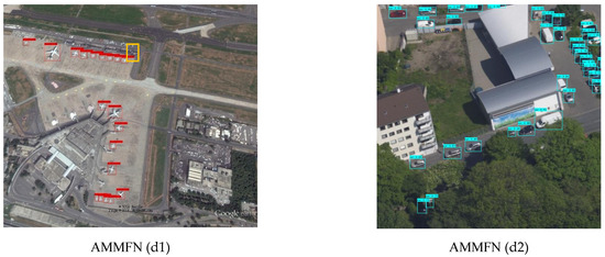 In addition, we randomly selected two typical images in the test set for testing the detection effect of YOLOv5s and AMMFN, and the original images and detection results are shown in Figure 9. AMMFN is able to detect small objects that both resemble the background or are obscured, although there is a case of missed detection, as shown in the yellow boxes. In addition, the number of objects detected by AMMFN and the accuracy of the regression boxes were better than those of YOLOv5s. Therefore, it can be emphasized that AMMFN can improve the model’s ability to detect small objects.