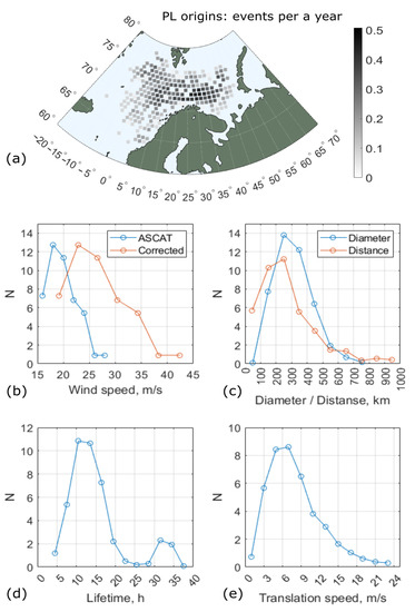 Statistical distributions of PL parameters: (a) mean annual spatial distribution of PL origins in 75 × 75 km grid cells [3]; (b) mean annual distribution of maximum wind speed from ASCAT [31] and its correction suggested by Polverari et al. [32], Equation (1); (c) mean annual distributions of PL diameter and traveled distance; (d) lifetime and (e) translation speed; data taken from [3].