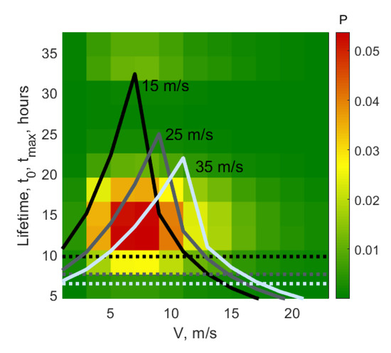 Color: joint probability of PL lifetime and translation speed. Dotted lines: time of wave development to reach a steady solution in a stationary, Equation (6), and (solid lines) moving, Equation (5), cyclone with diameter 300 km and maximum wind speed 15, 25 and 35 m/s (white, grey and black lines correspondingly.