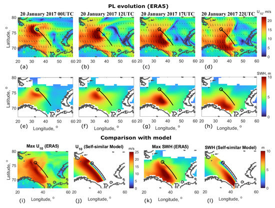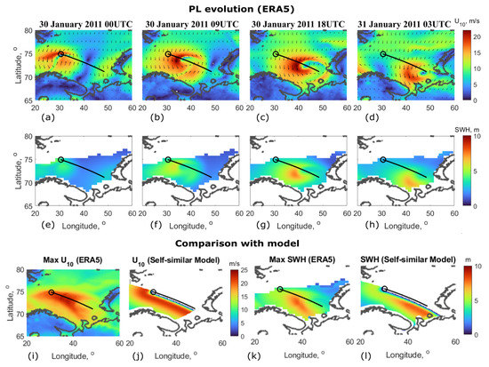 Another case, PL#2, occurred on 30–31 January 2011, also in the Barents Sea. It moved in east–south–east direction with mean velocity of 8 m/s and changed its direction to the southward at the final stage (Figure 4a–d). Although the shape of its wind radial profile is more symmetrical than PL#1 (compare Figure 3i and Figure 4i), the highest waves are still observed to the right of the PL trajectory where the wave group velocity resonance is expected (Figure 4e–h).