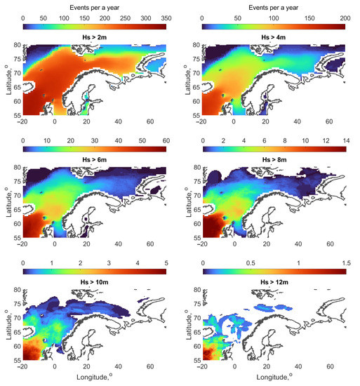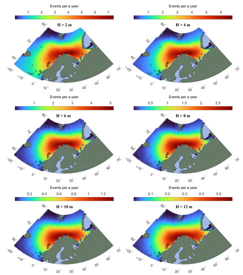 Spatial distributions of the annual number of events, associated with PLs, with SWH greater than 2, 4, 6, 8, 10 and 12 m, are presented in Figure 5. The probability fields are qualitatively similar. The region in the vicinity of the North of the Scandinavian peninsular, is where high waves are likely the most frequently observed. The Greenland Sea and the South of Norwegian Sea are apparently less affected by PLs and PL-generated waves. Waves higher than 4–6 m occur 5–6 times a year at any point of the East of Norwegian Sea and South of Barents Sea; waves larger 8–10 m appear 1–2 times a year, and SWHs greater than 12 m can appear once in several years. The frequency of appearance of 15 m waves associated with PLs is less than once in 10 years (not shown).