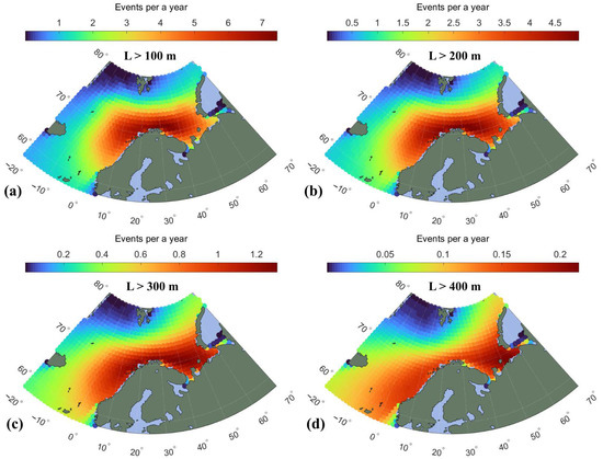Figure 6 presents spatial distribution of the annual number of cases when wavelengths of the PL-generated waves exceed 100, 200, 300 and 400 m. For relatively short waves, about 100 m in wavelength, the distribution qualitatively repeats that for SWHs: compare Figure 5 and Figure 6a. As developed, the length of swell waves does not decrease, and even slightly increases with distance, in contrast to strong wave height attenuation, as shown in Equation (8). For the most intense PLs, this leads to the appearance of long (though not always too high) waves along the whole coastline from the west of Norwegian peninsular to the north of Novaya Zemlya, including the Pechora Sea (Figure 6b,c).