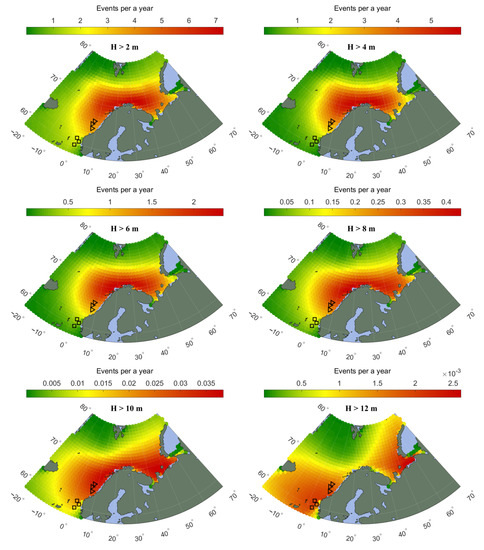 Spatial distribution of the annual number of events when SWH of PL-generated waves exceeds the specified threshold values: 2 m, 4 m, 6 m, 8 m, 10 m and 12 m. Black triangles are location of maritime stations 76,925, 76,928 and 76,930; squares are stations 76,923, 76,931 and 76,932.