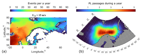 Spatial distributions of the annual number of PL cases using Equation (10) are qualitatively and quantitatively consistent with the PL track density, i.e., the number of storms within a radius of 100 km, calculated by Romero and Emanuel [50] from the reanalyses (ERA-Interim and NCEP–NCAR) and from the set of numerical models. These authors (see their Figure 5 in [50]) obtained about 200 cases per century for the region to the north of Scandinavian peninsular, slightly less than the values presented in Figure 8b. This is still fairly tolerable, considering the typical PL density underestimation inherent to the methods based on numerical simulations and reanalysis.
