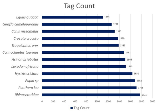 Species Distribution for the Sub-Saharan Training Dataset. The largest number of tags was for the Rhinocerotidae (1771) and the lowest was for the Equus quagga (1099).