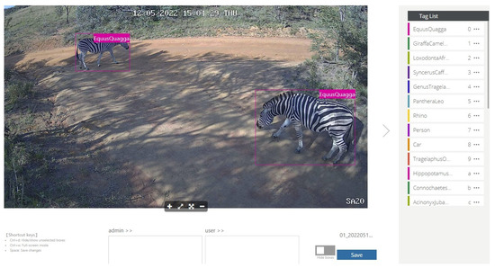 Following quality checks, between 1099 and 1771 tags per species were retained (17,712 in total). Tags are labelled binding boxes that mark the location of an object of interest (animal) within an image. Binding boxes were added to an image using the Conservation AI tagging website, which are serialised as coordinates in an XML file using the PASCAL VOC format [82]. The Conservation AI tagging site is shown in Figure 3.