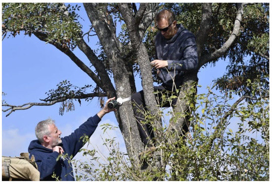 XML files are an intermediary representation used to generate TFRecords (a simple format for storing a sequence of binary records). Before the TFRecords were created, the tagged dataset was randomly split into a training set (90%—15,941 tags) and a validation set (10%—1771). Using the Tensorflow Object Detection API, the training and validation datasets were serialised into the two separate TFRecords and used to train the Sub-Saharan African model. The trained model was evaluated over the course of the trial with images obtained from 27 fixed Reolink Go 3/4G cameras installed in Weldgevonden Game Reserve in Limpopo Province in South Africa. Figure 4 shows an example of a camera being installed.