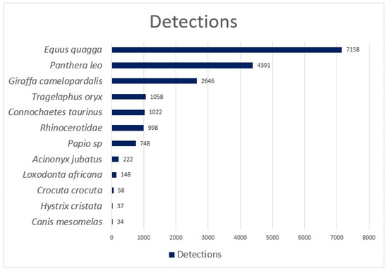 The Reolink Go cameras were donated to us for the study by Reolink, and the 3/4G SIM cards were donated to us by Vodacom. The installed camera traps captured 12 different species over a ten-month period, which starting in May 2022 and ending in February 2023. During the trial period, 18,520 detections were made, and 19,380 blanks were reported, totalling 37,900 images. Figure 5 summarises the number of species identified during the trial.