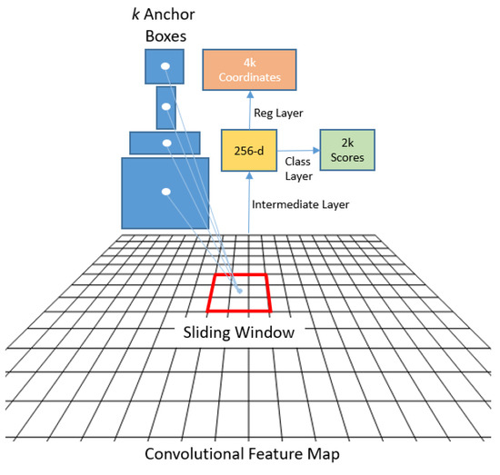 The RPN produces two outputs for each anchor bounding box: a probability objectness score and a set of bounding box coordinates. The first output is a binary classification that indicates whether the anchor box contains an object or not, while the second provides a bounding box regression adjustment. During the training process, each anchor is classified as belonging to either a foreground or background category. Foreground anchors are those that have an intersection over union (IoU) greater than 0.5 with the ground-truth object, while background anchors are those that do not. The IoU is defined as the ratio of the intersection to the union of the anchor box and the ground-truth box. To create mini-batches, 256 balanced foreground and background anchors are randomly sampled, and each batch is used to calculate the classification loss using binary cross-entropy. If there are no foreground anchors in a mini-batch, those with the highest IoU overlap with the ground-truth objects are selected as foreground anchors to ensure that the network learns from samples and targets. Additionally, anchors marked as foreground in the mini-batch are used to calculate the regression loss and transform the anchor into the object. The IoU is defined as:
