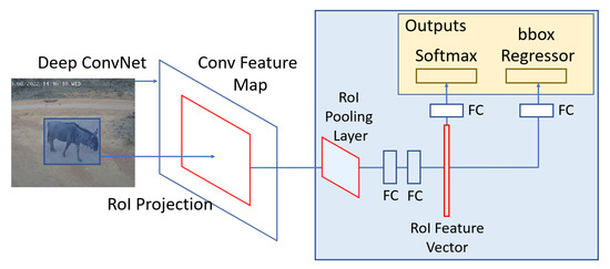 The Faster R-CNN architecture was trained to detect and classify 12 animal species [79]. The architecture comprises three components: (a) a convolutional neural network (CNN) [84] that generates feature maps [85] and performs classification, (b) a region proposal network (RPN) [79] that generates regions of interest (RoI), and (c) a regressor that locates each object in the image and assigns a class label. Figure 6 shows the Faster R-CNN architecture.