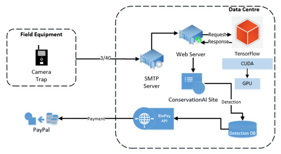 Wildlife conservationists employ a variety of technologies, including drones [33,34,35], camera traps [36], and acoustics [37], to detect and monitor animals in their natural habitats. However, drones can pose challenges as animals are difficult to discern from high altitudes, and their noise can disturb and frighten many species. While audio monitoring has been useful, its effectiveness is contingent on animals making detectable sounds. Camera traps offer a comprehensive view of the environment and enable the identification of different species, as well as individual animal counts. Therefore, this paper proposes a solution that utilises deep learning and 3/4G camera traps to identify animal species and facilitate financial transactions between wildlife accounts and local stakeholders. It differs from the original “Interspecies Money” concept in that it does not use individual identification but simply detections of the species. Using a region-based model, animals are detected in images as and when they are captured in camera traps installed in Welgevonden Game Reserve in Limpopo Province in South Africa. Each animal species group is given a makeshift bank account with GBP 100 credit. Every time an animal is successfully classified in an image, 1 penny is transferred from the animal account to the guardian. Note that this is an arbitrary amount and mechanisms still need to be developed to set the value of species. Figure 1 shows an example detection using our deep learning approach. In this example, three pence would be transferred from the species account to the guardian.