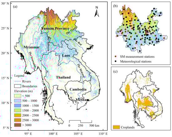 The GMS geographically consists of Yunnan in China and five countries in Indochina Peninsula (Figure 1a). Four large transboundary rivers pass through the region, namely the Irrawaddy River, the Salween River, the Mekong River, and the Red River. The GMS is dominated by monsoon climates, with the rainy season of approximately half a year (from May to October) and the dry season of another half year (from November to April of the next year) in most areas. The precipitation in the wet season accounts for more than 80% of the total annual precipitation. It is affected by the East Asian and Indian summer monsoon []. The GMS is vulnerable to hydrological extremes such as floods or droughts []. Due to a large area of arable land (Figure 1c), grain yield is high in the GMS, which plays a critical role in food safety and human livelihoods; furthermore, agriculture is the major contributor to the local economy.