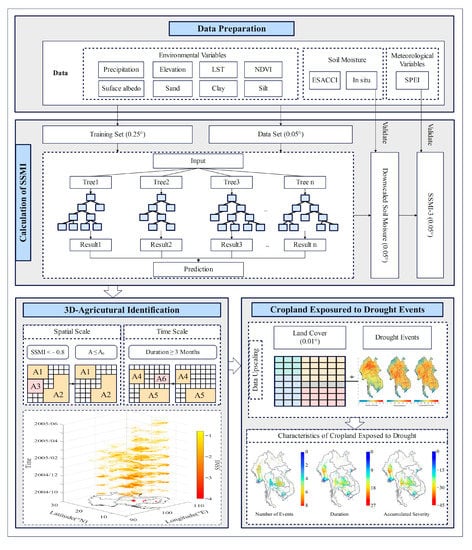 As shown in Figure 2, the framework of this study includes four parts—part 1: data preparation; part 2: calculation of SSMI using high spatial resolution SM data; part 3: identification of agricultural droughts based on a 3D method and part 4: calculation of cropland’s exposure to agricultural drought events.